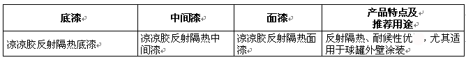 有反射隔熱作用,同時(shí)具有優(yōu)良的耐候性能,適用于夏季及高溫環(huán)境條件下各類化工原料罐、液化氣罐、儲(chǔ)油罐、;愤\(yùn)輸車罐體等露天擱置的設(shè)備及構(gòu)件的隔熱面涂。