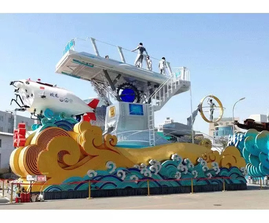 “江蘇智造”彩車長15米、寬6米、高9.78米。彩車分為上中下三部分,底層如意造型,配以金色、深藍、青綠等色彩組合,彰顯江蘇水鄉(xiāng)水韻的區(qū)域特征;中層的江蘇科技標識性元素,再現(xiàn)了江蘇國內(nèi)領先的科技實力和發(fā)達的制造業(yè);上層表現(xiàn)科技智能制造的意象化結構,配合以科技智能創(chuàng)造為主題的舞蹈表演,寓意新時代“強富美高”新江蘇奮力拼搏的創(chuàng)新精神。