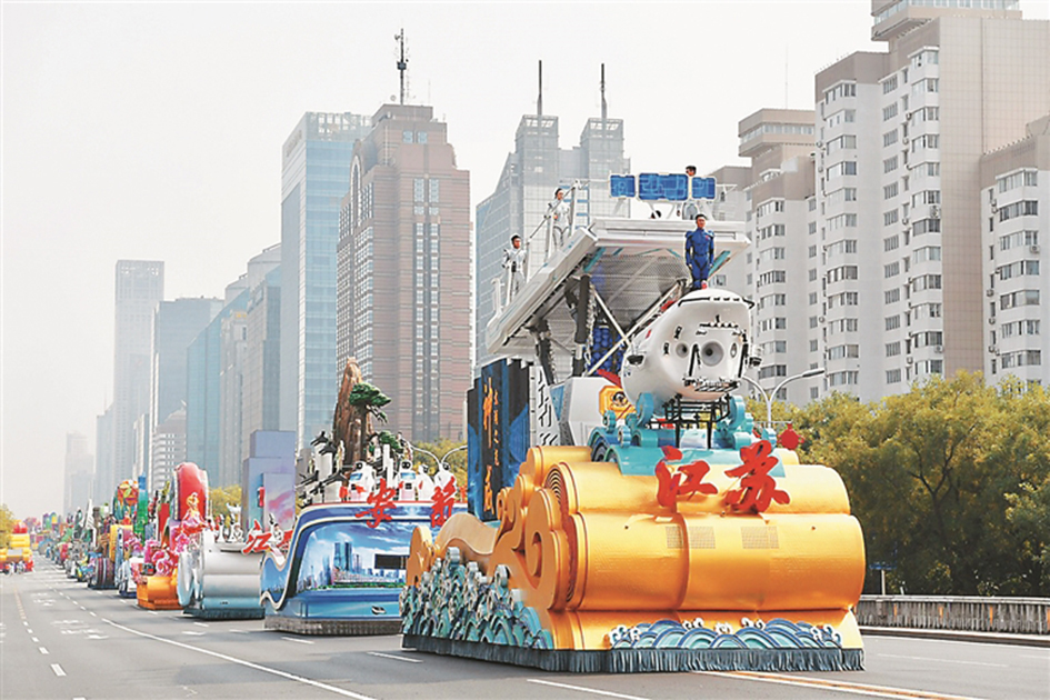 這一天,江蘇巡游彩車在天安門廣場驚艷亮相,江蘇智造的形象格外亮眼!